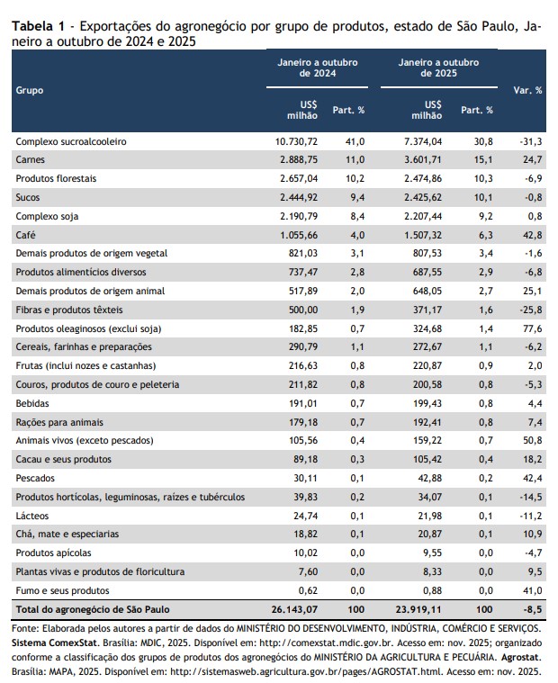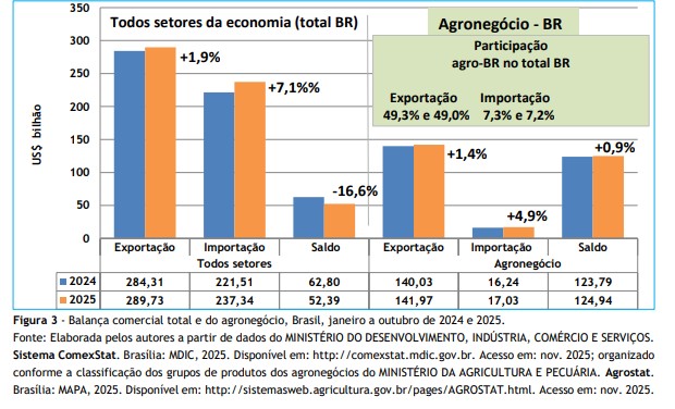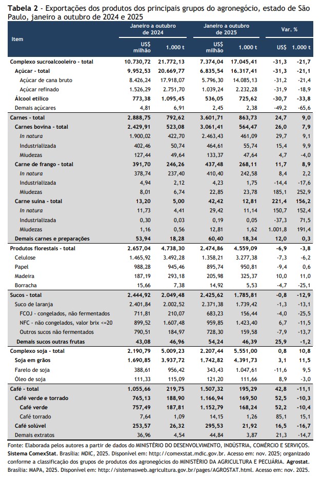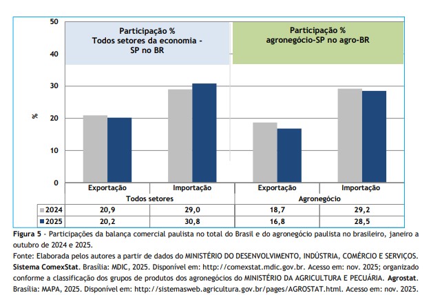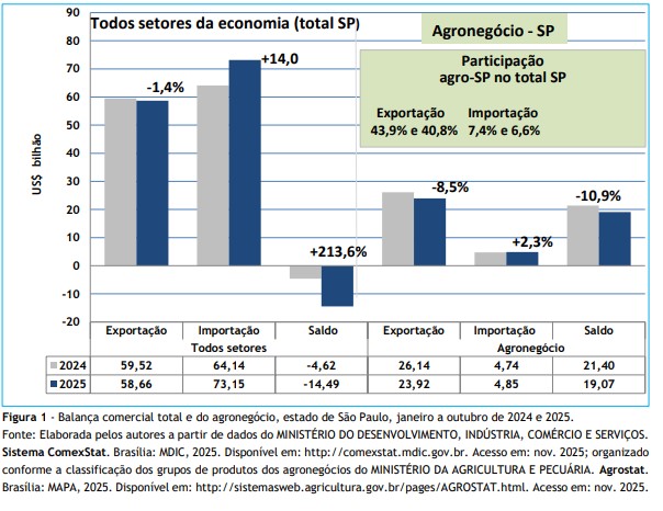 Balança Comercial dos Agronegócios Paulista e Brasileiro, Janeiro a Outubro de 2025