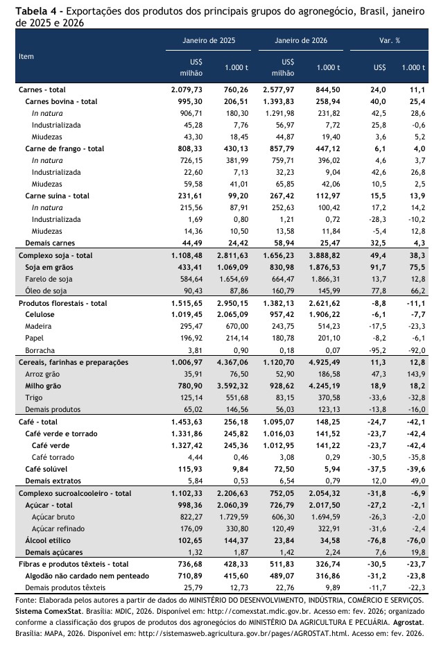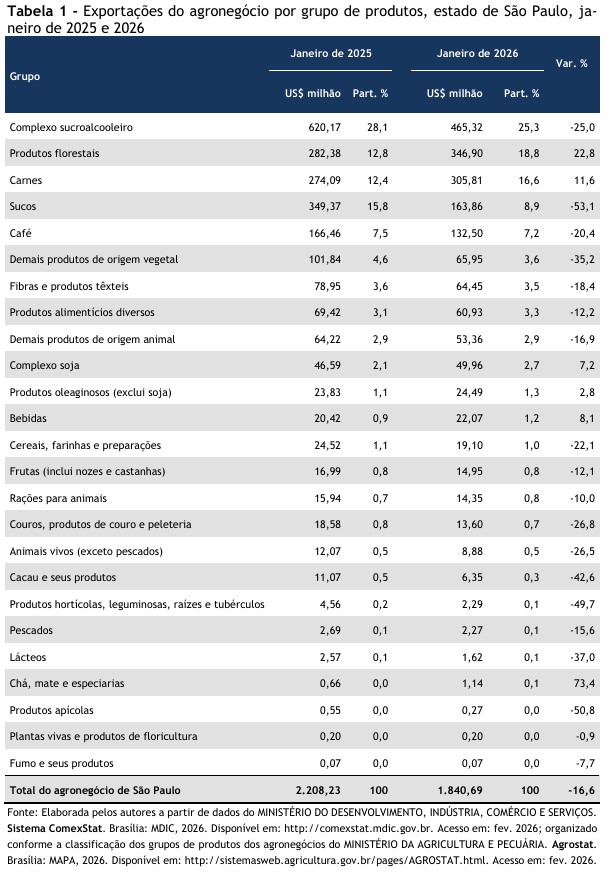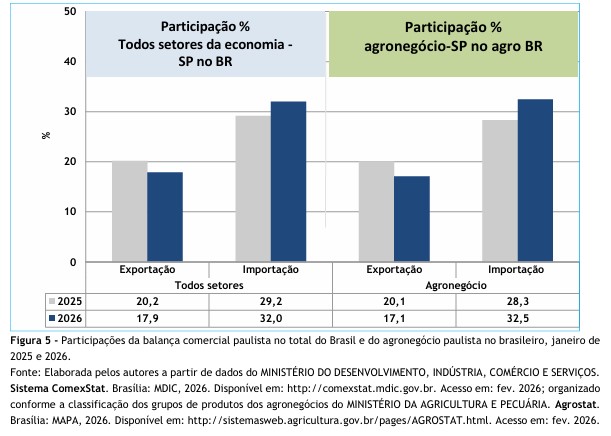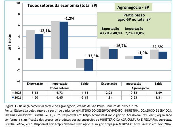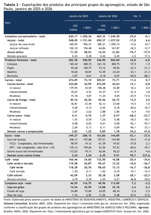 agronegócio paulista no brasileiro, janeiro de 2025 e 2026.