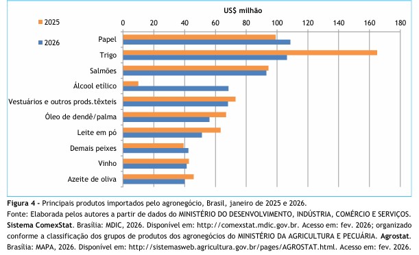 importação do agronegócio brasileiro em janeiro de 2026 foram: papel (US$108,60